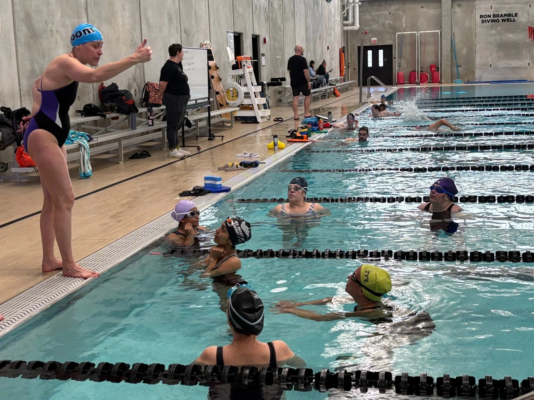 Workouts are coached and last 60 to 90 minutes depending on the scheduled pool time.